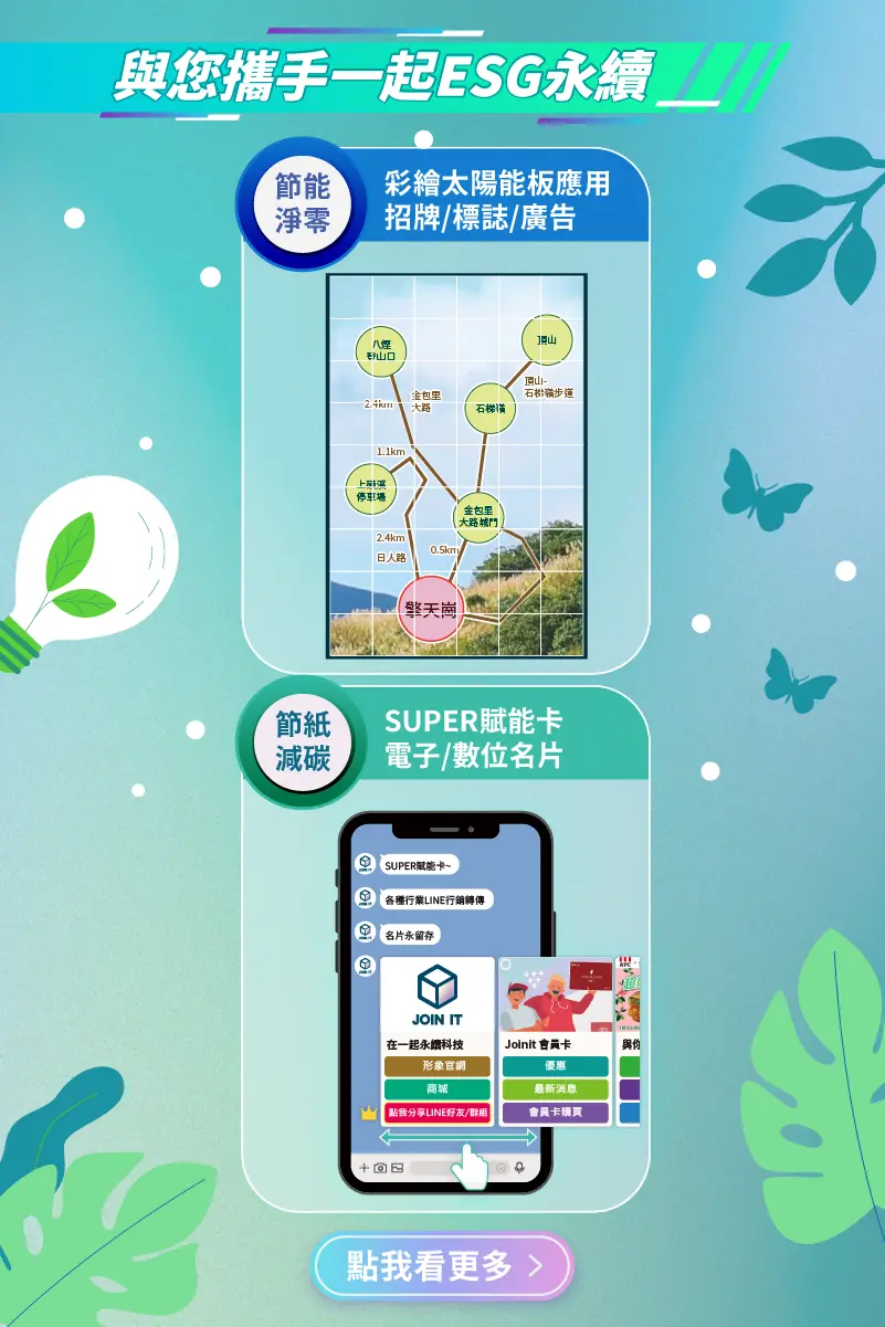 透過數位技術協助企業與品牌進行ESG永續與產業轉型,透過數位工具的開發以能夠達到 即時直效經營推廣、線上線下銷售與服務、資源有效串聯共享、資訊安全為目標並符合ESG淨零碳排。