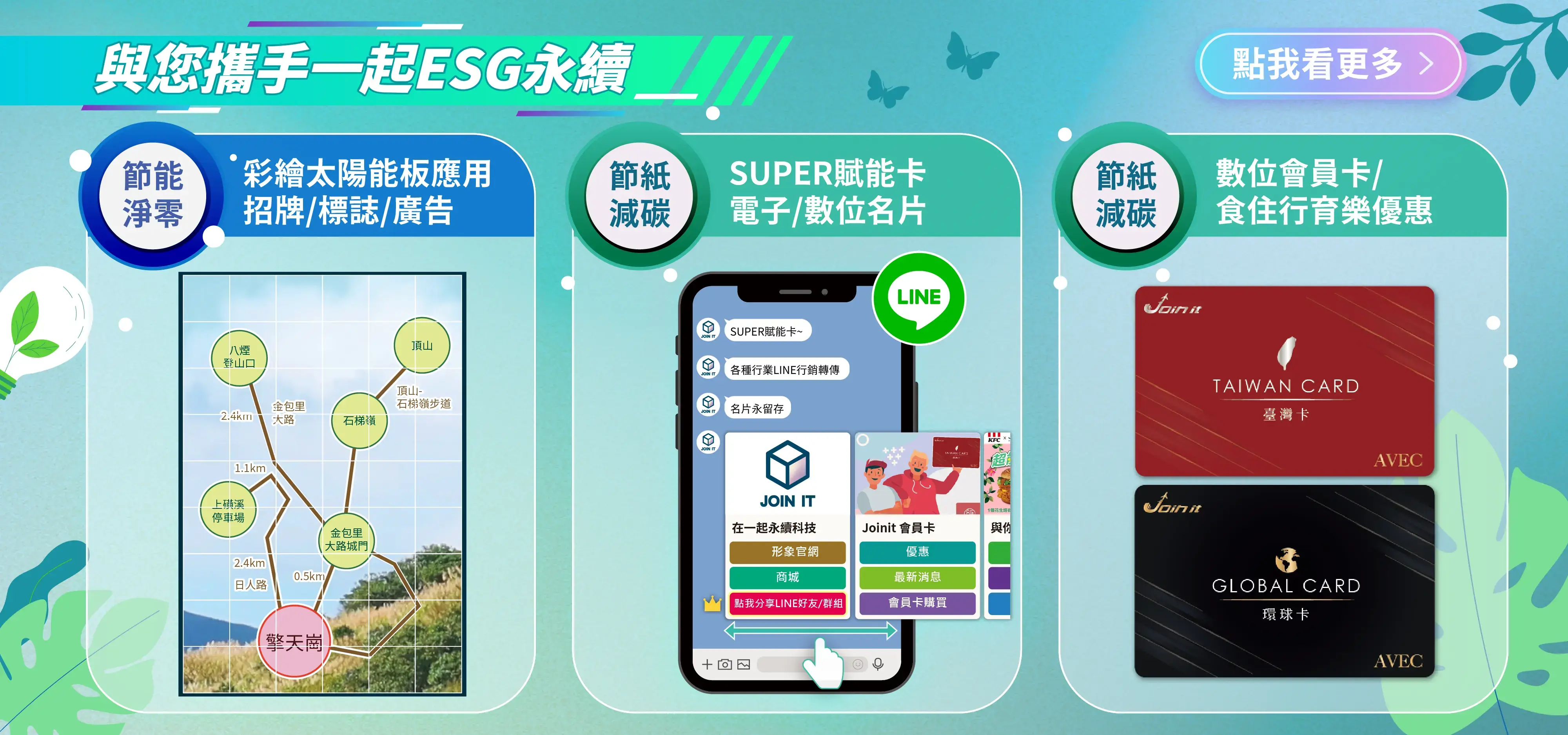 集聚「食住遊購行」全台超過250間以上的特約商家優惠,只要擁有JOIN IT 會員卡,一卡在手,盡享生活。此外,還有企業聯名會員卡、數位社交卡、商店街的購物及兌換點數活動,讓聰明消費的優質生活無處不在。